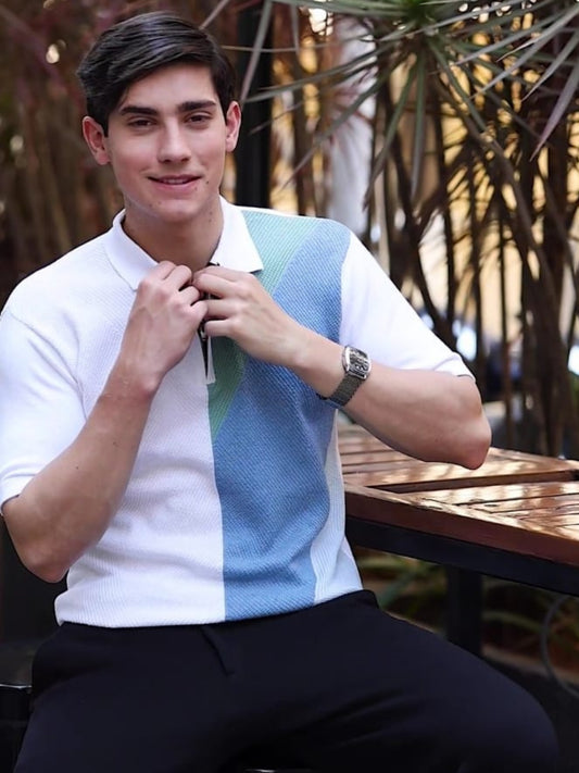 Geometric Pattern Knit Polo T-Shirt – Navy & White