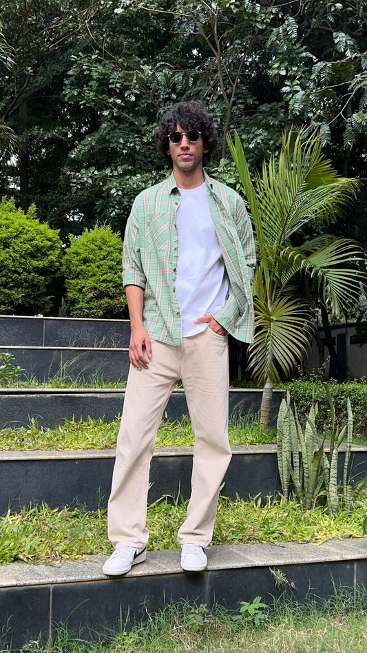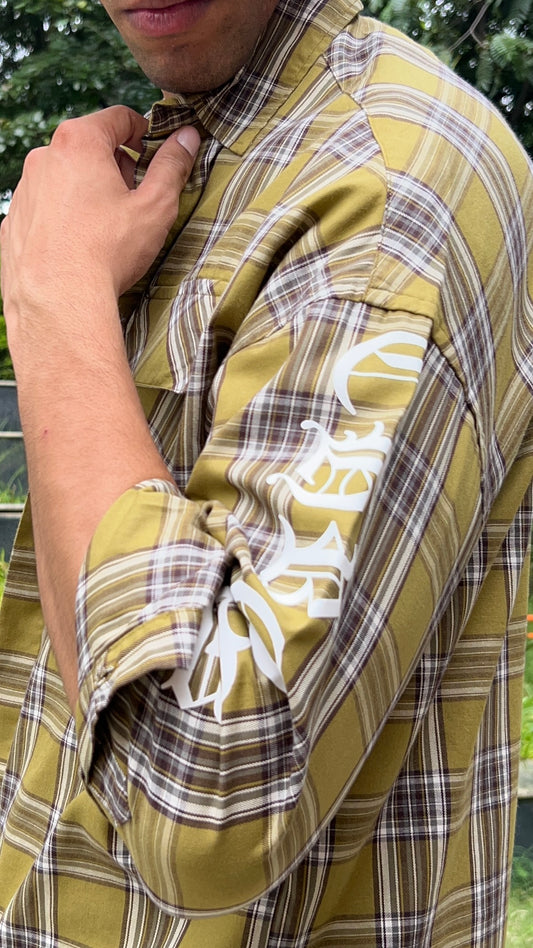 Olive Brown Check Shirt with Sleeve Print