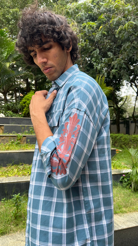 Mustard Blue Checked Shirt with Sleeve Print