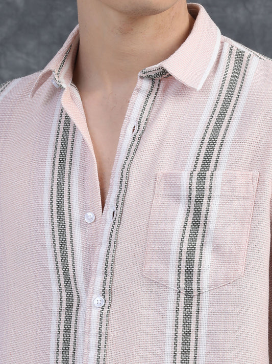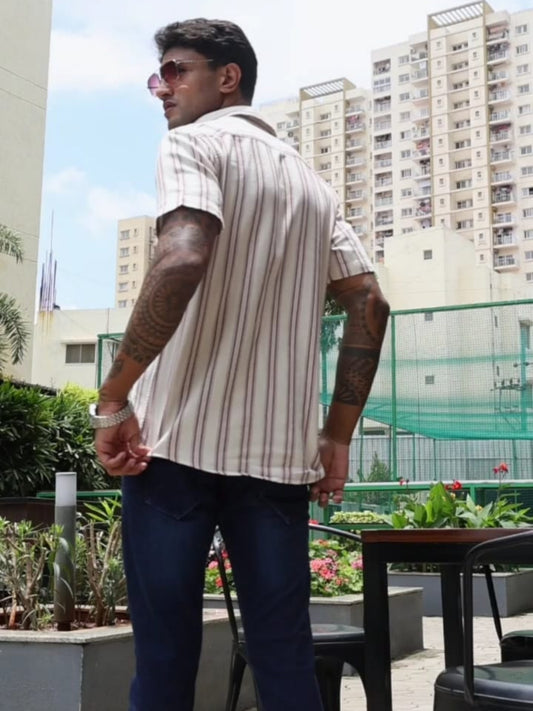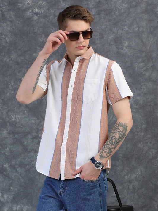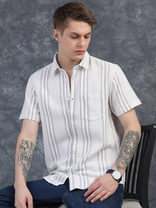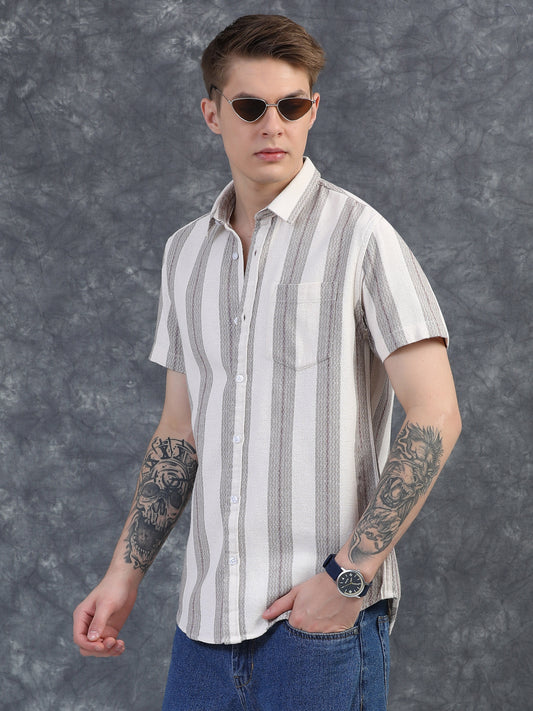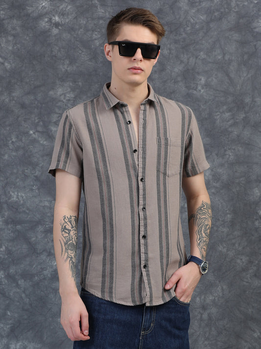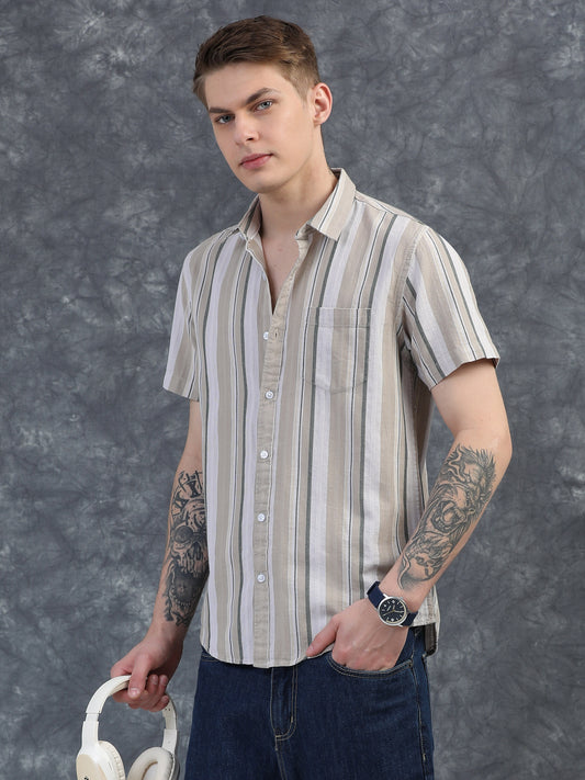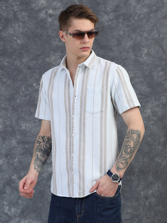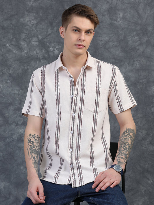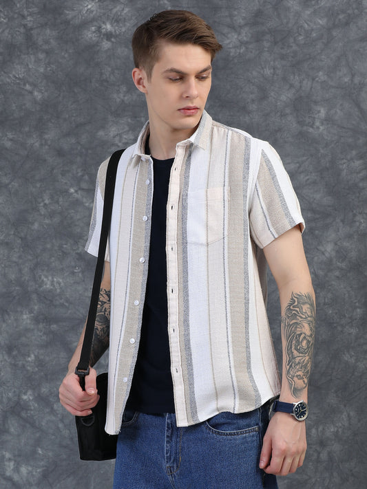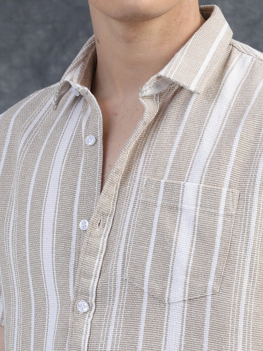 Half-Sleeve Beige Multi-Stripe Textured Shirt