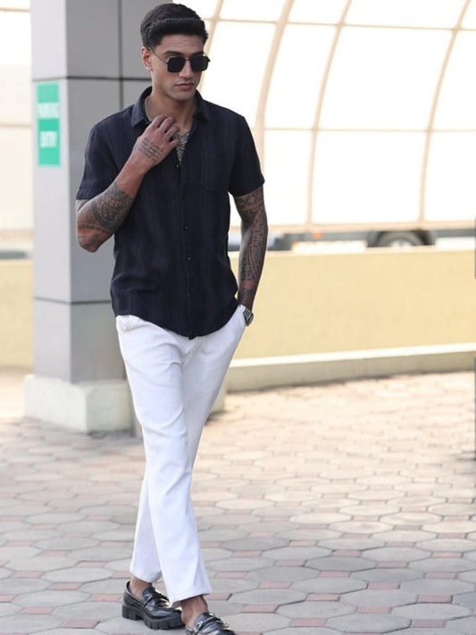 Half-Sleeve Deep Navy Multi-Stripe Textured Shirt