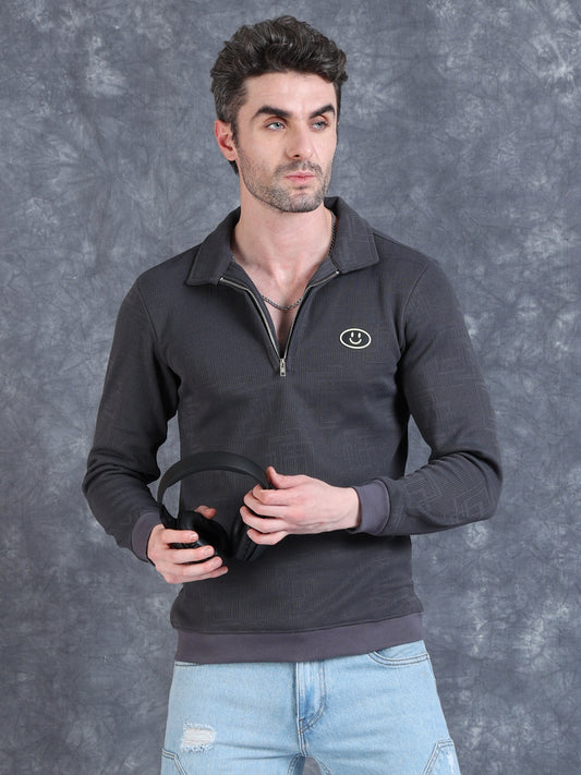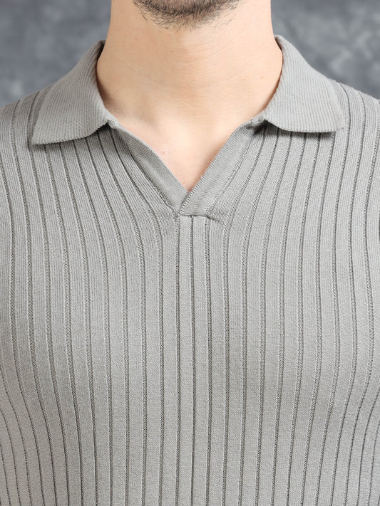 Ribbed Texture Full Sleeve Polo T-Shirt Grey