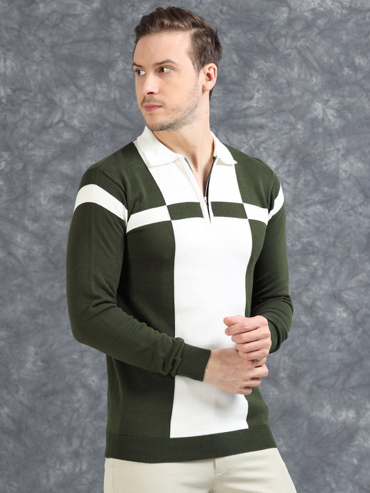 Pannel Design Full Sleeve Zipper Polo - Dark Green
