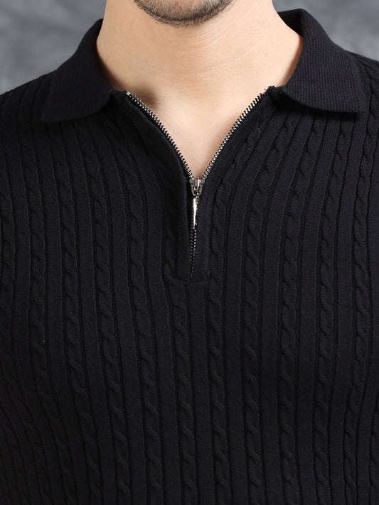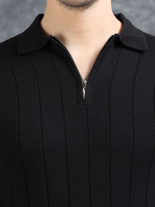 Ribbed Design Zipper Polo T-Shirt- Black