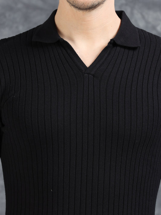 Ribbed Texture Full Sleeve Polo T-Shirt Black