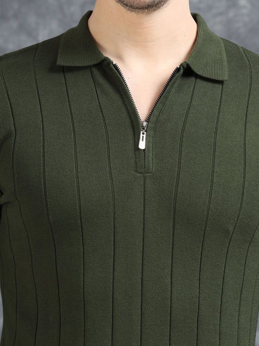 Ribbed Design Zipper Polo T-Shirt- Dark Green