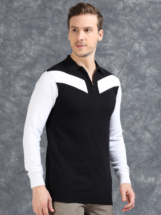 Pannel Design Full Sleeve Zipper Polo - Jet Black