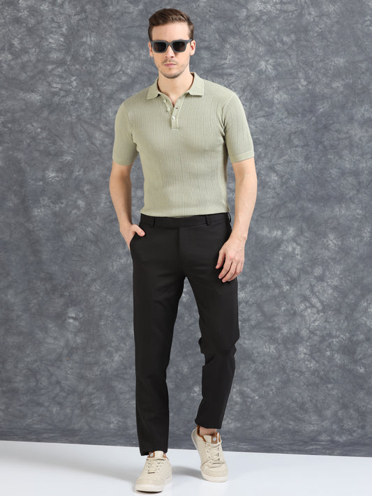 Ribbed Design Zipper Polo T-Shirt- Pistachio
