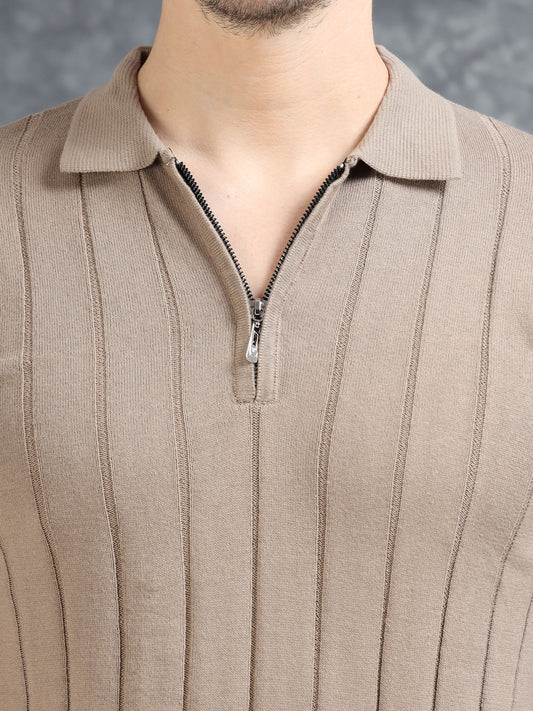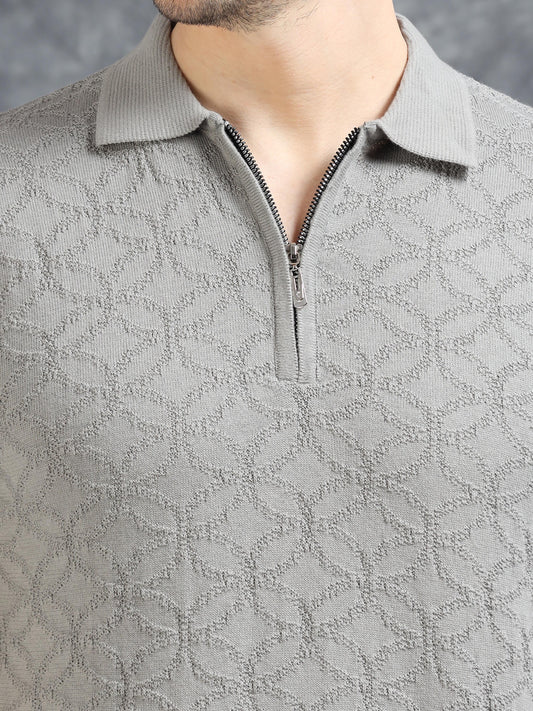 Ribbed Design Zipper Polo T-Shirt- Grey