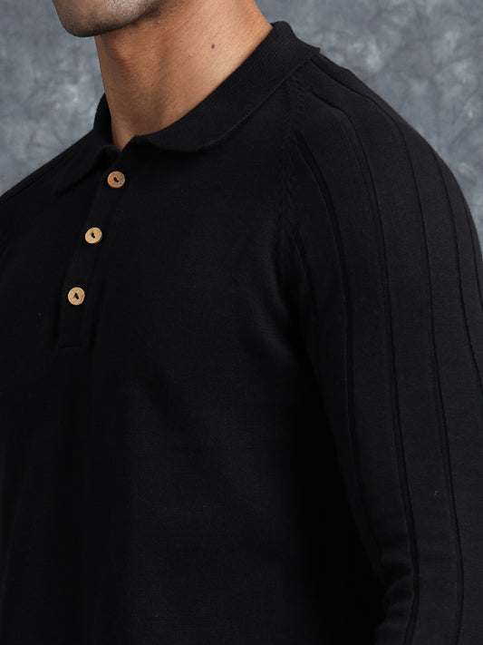 Black Cotton Knitted Polo Full Sleeve Knitted T-Shirt