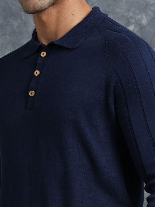 Navy Cotton Knitted Polo Neck Full Sleeve Knitted T-Shirt