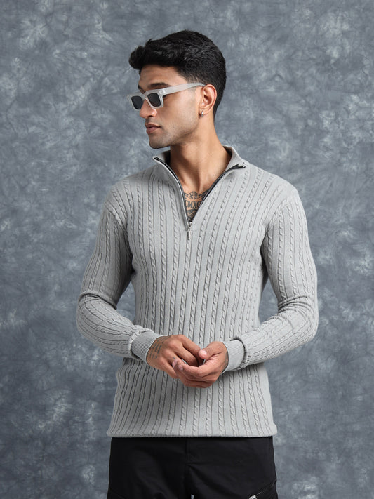 Grey Zipper Turtle Neck Full Sleeve Knitted T-Shirt