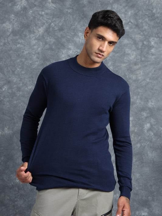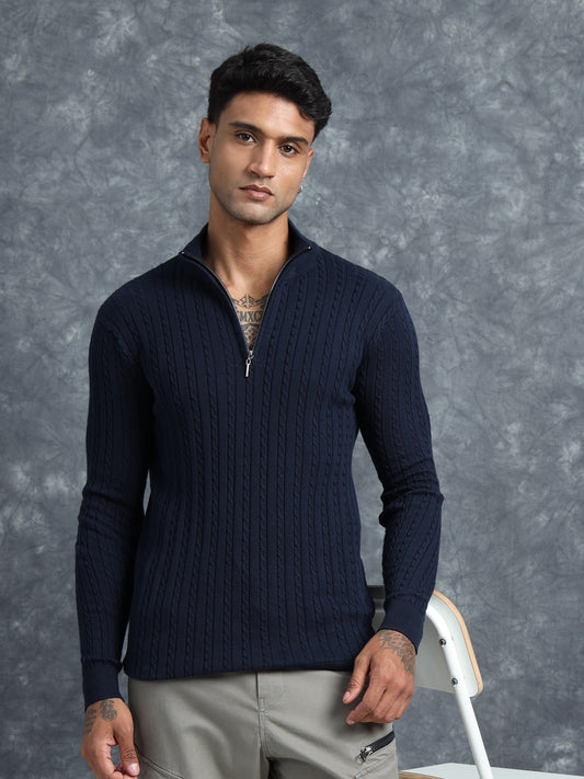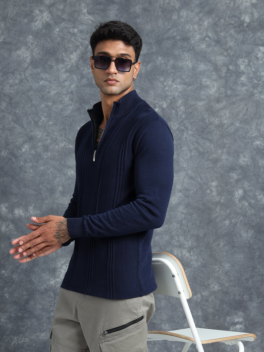 Midnight Blue Full Sleeve Zipper Knitted T-Shirt