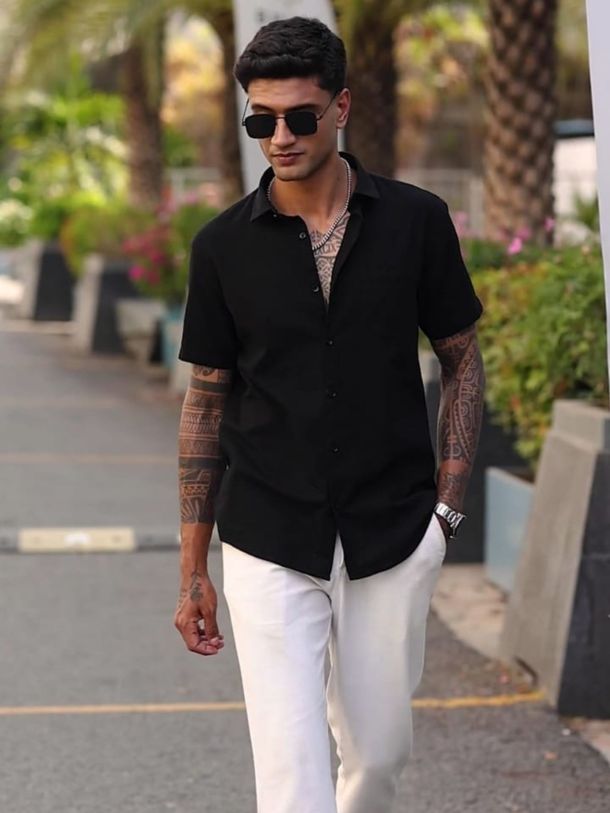 JET BLACK TEXTURED FABRIC HALF SLEEVES SHIRTS