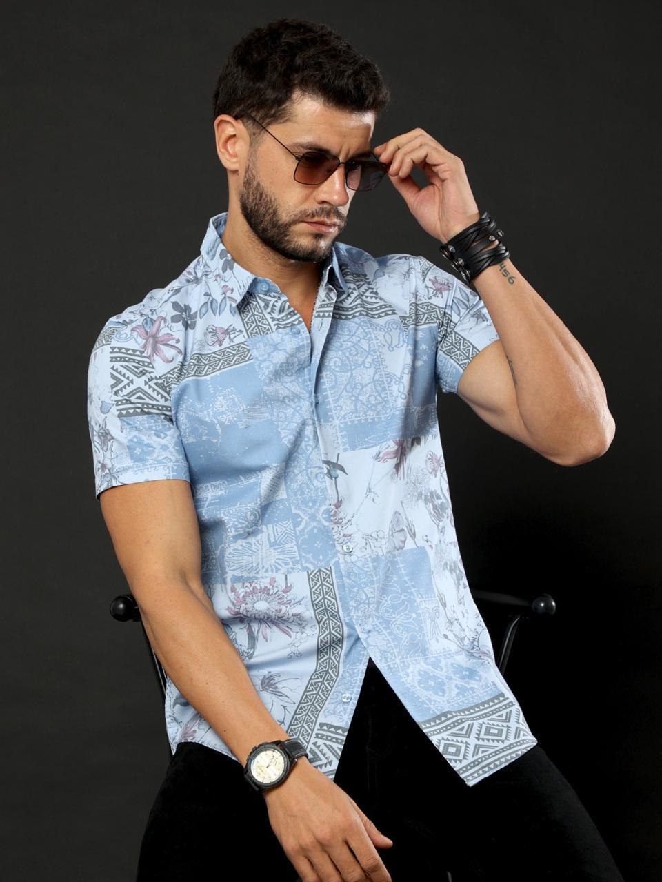 Sunny Blooms Printed SkyBlue Half Sleeve Shirt