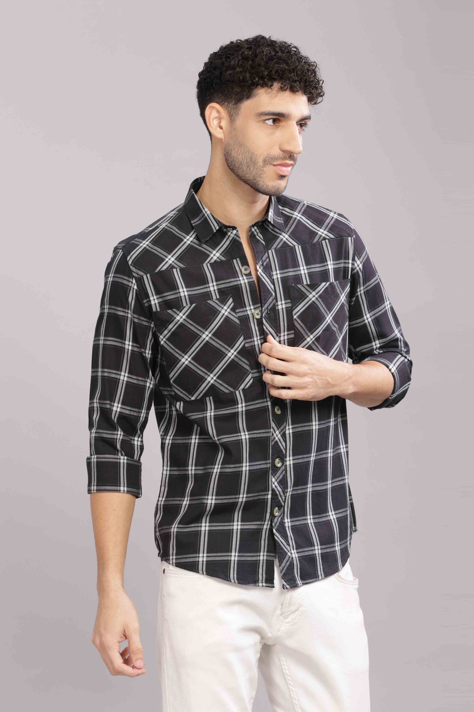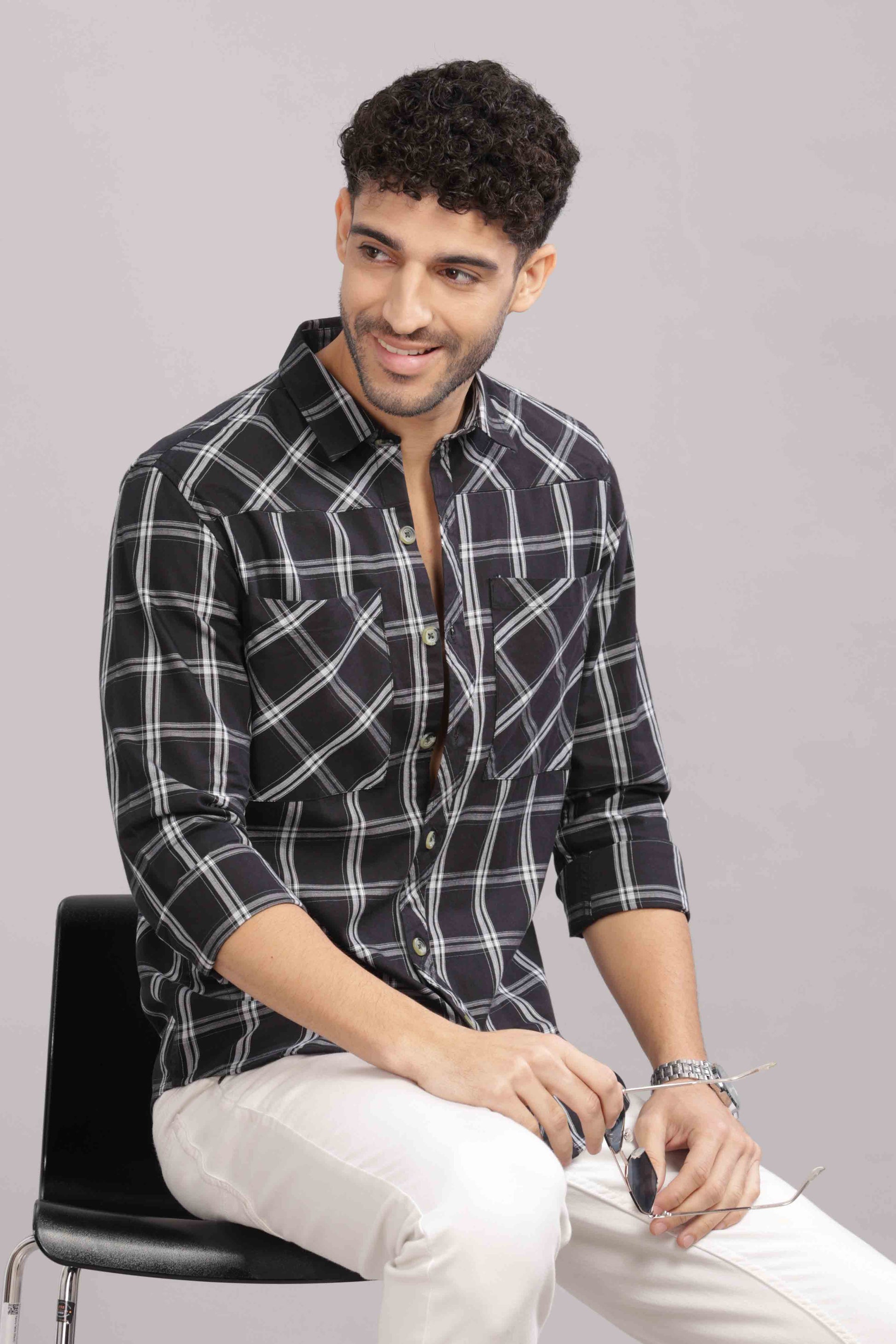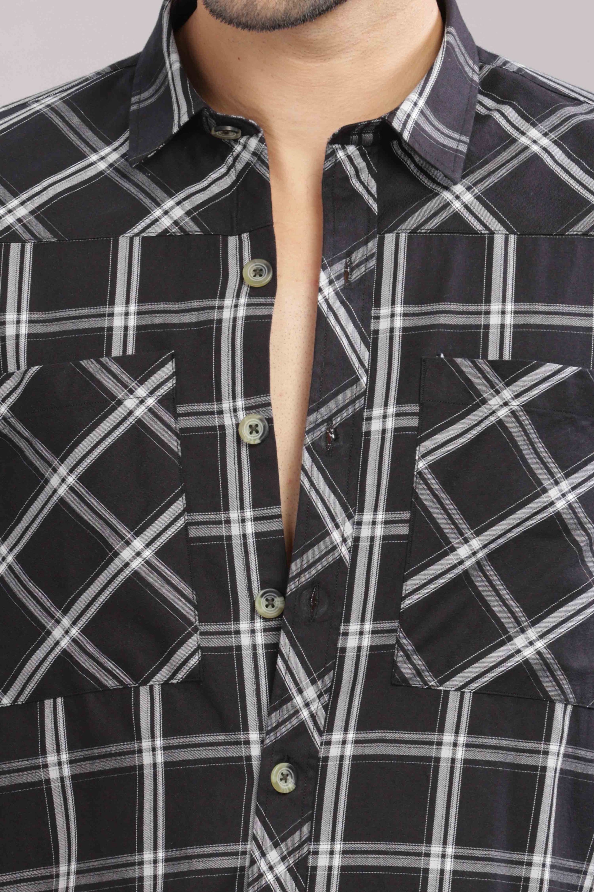 Black Double Box Pocket Checks Shirt