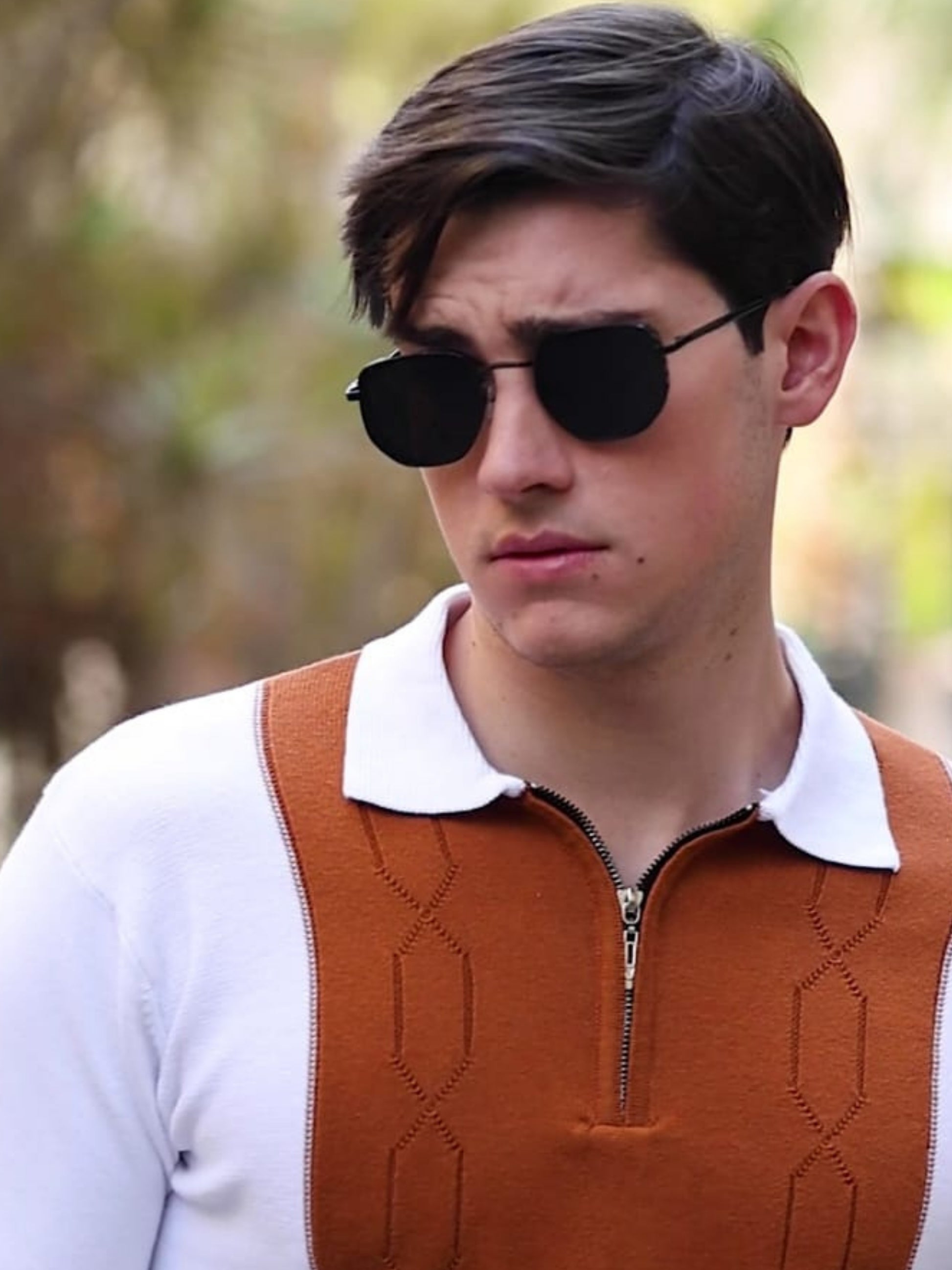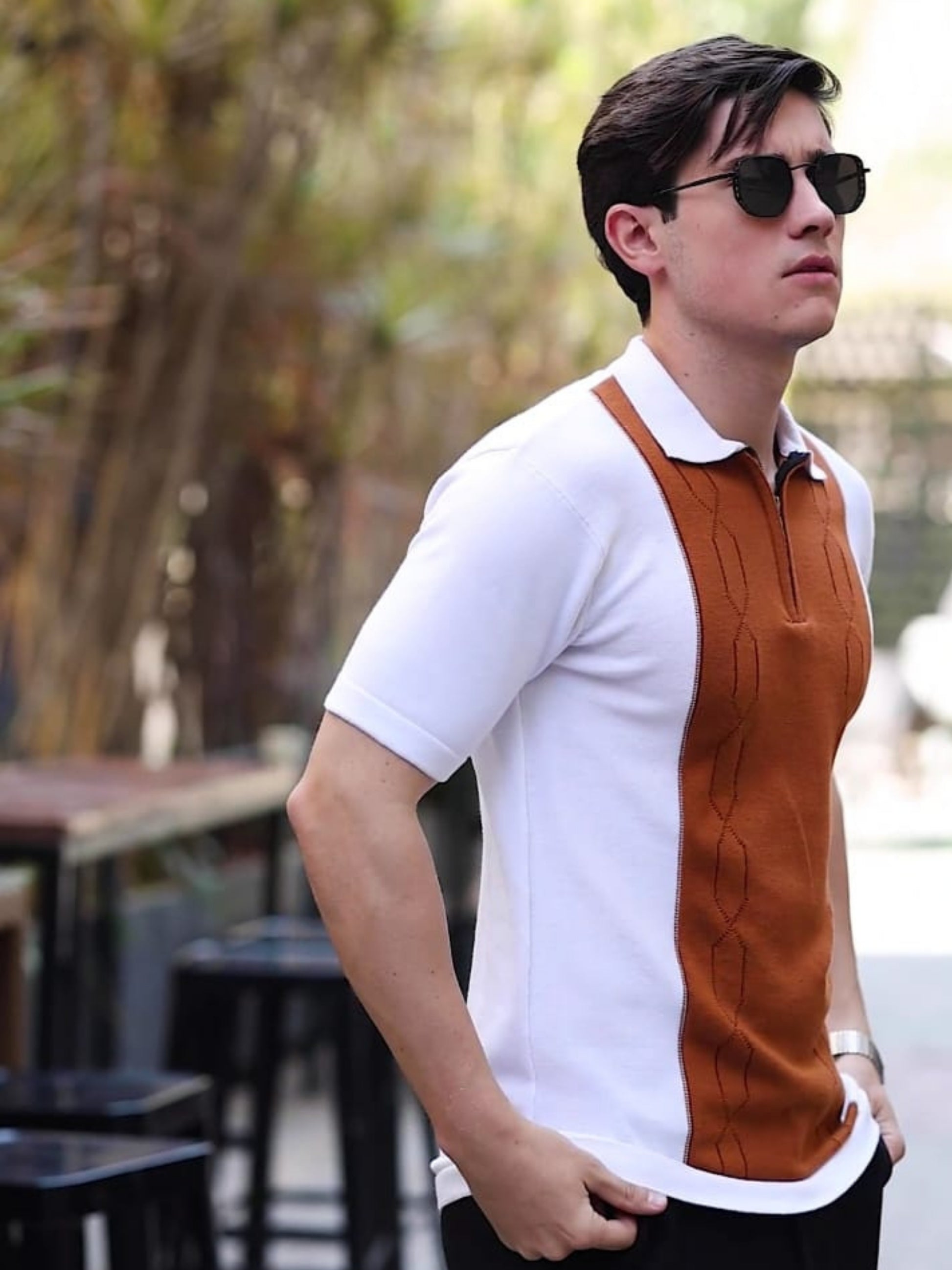 Ribbed Design Zipper Polo T-Shirt- Brown