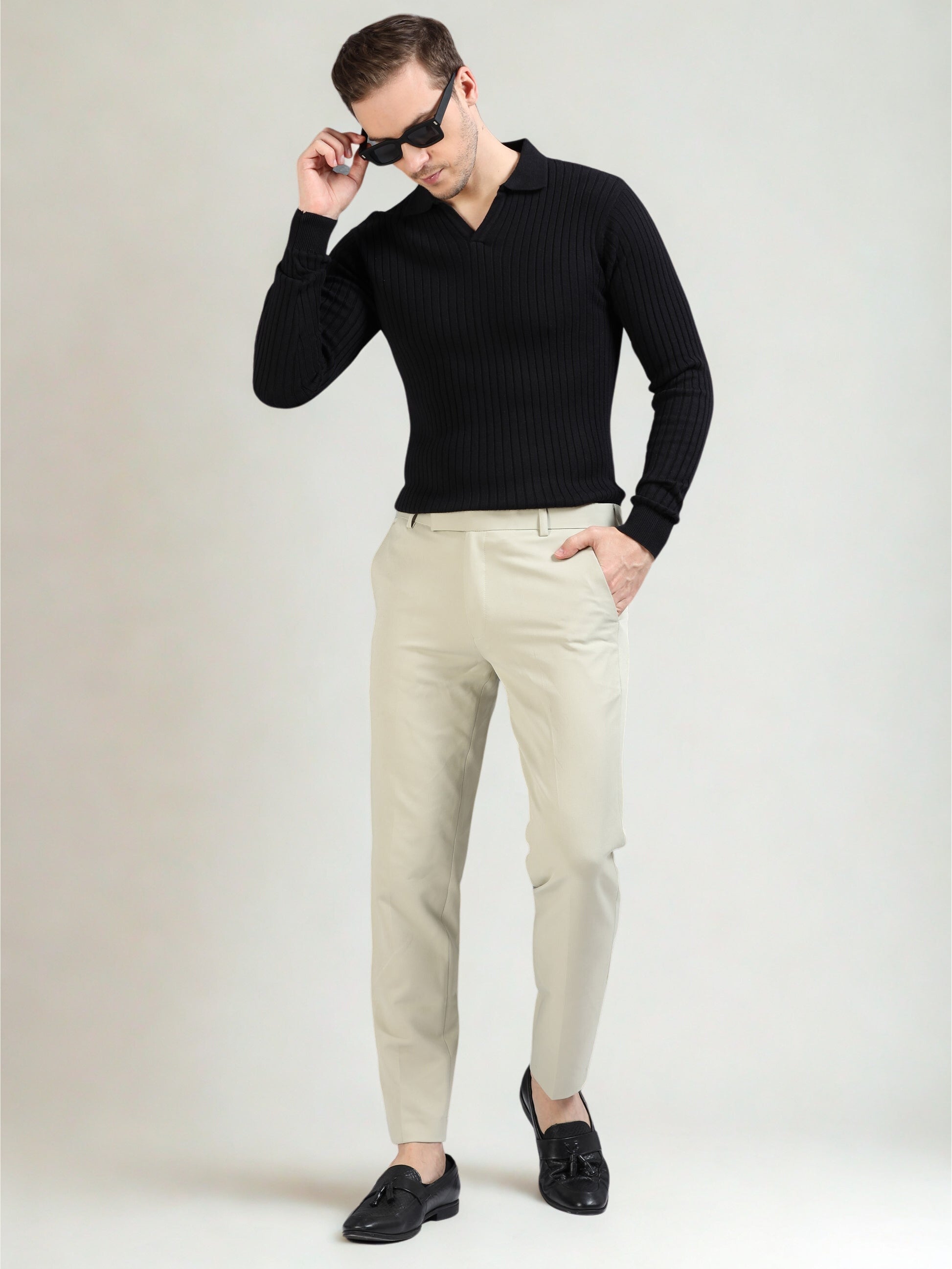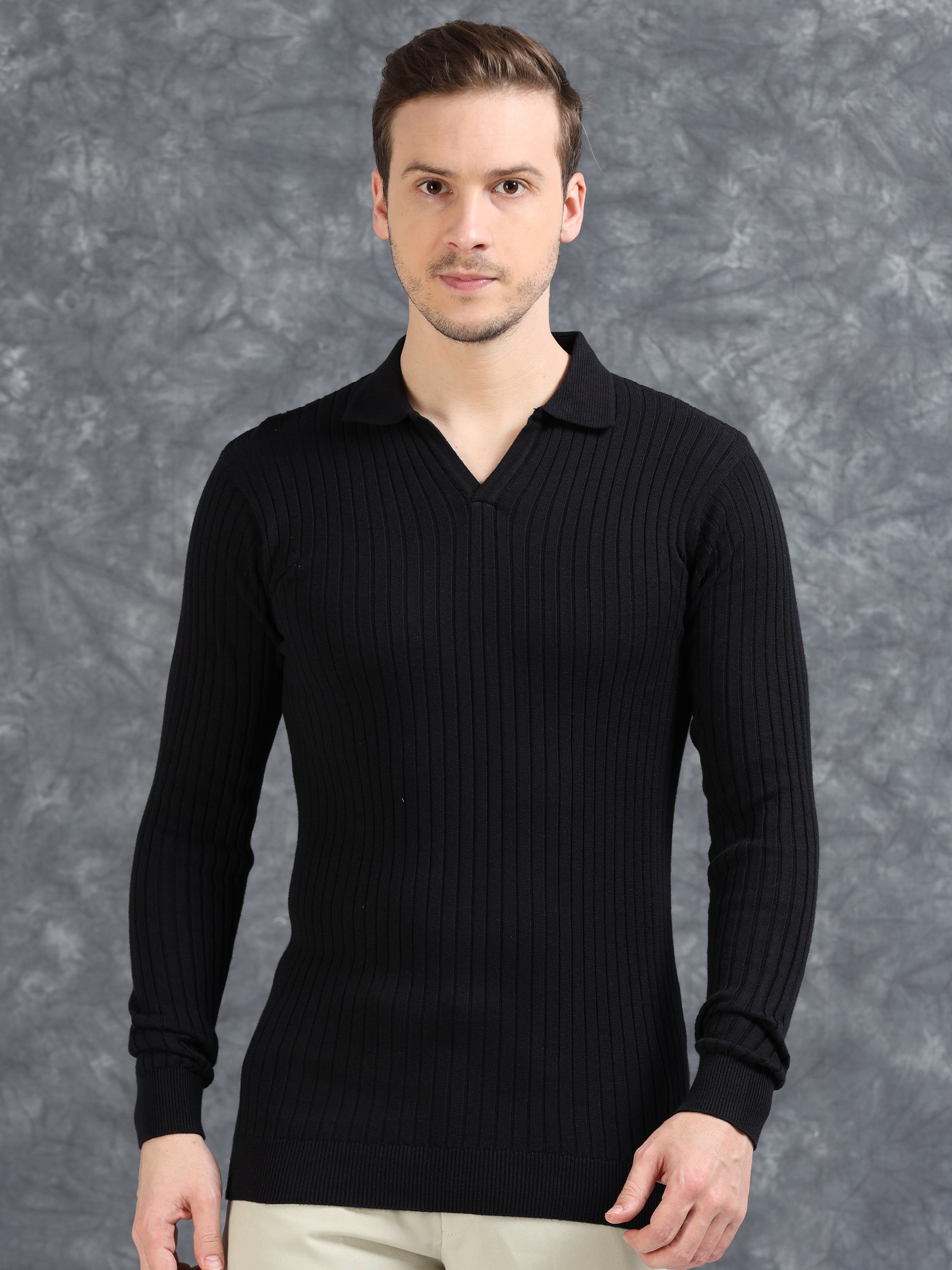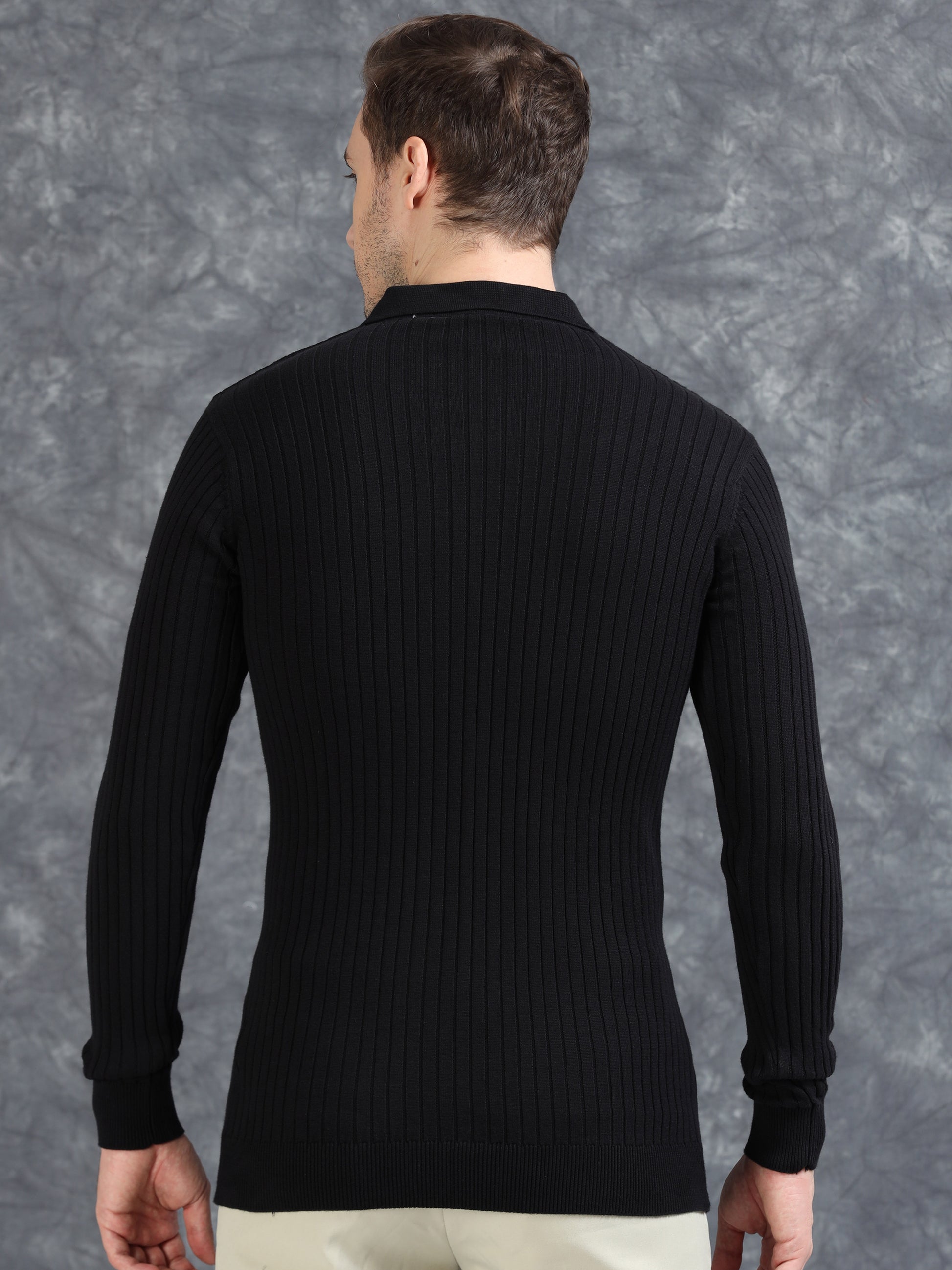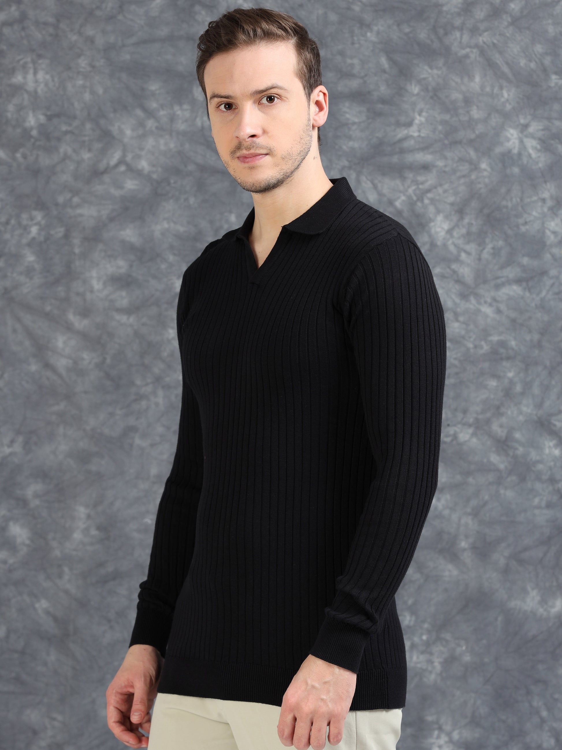 Ribbed Texture Full Sleeve Polo T-Shirt Black